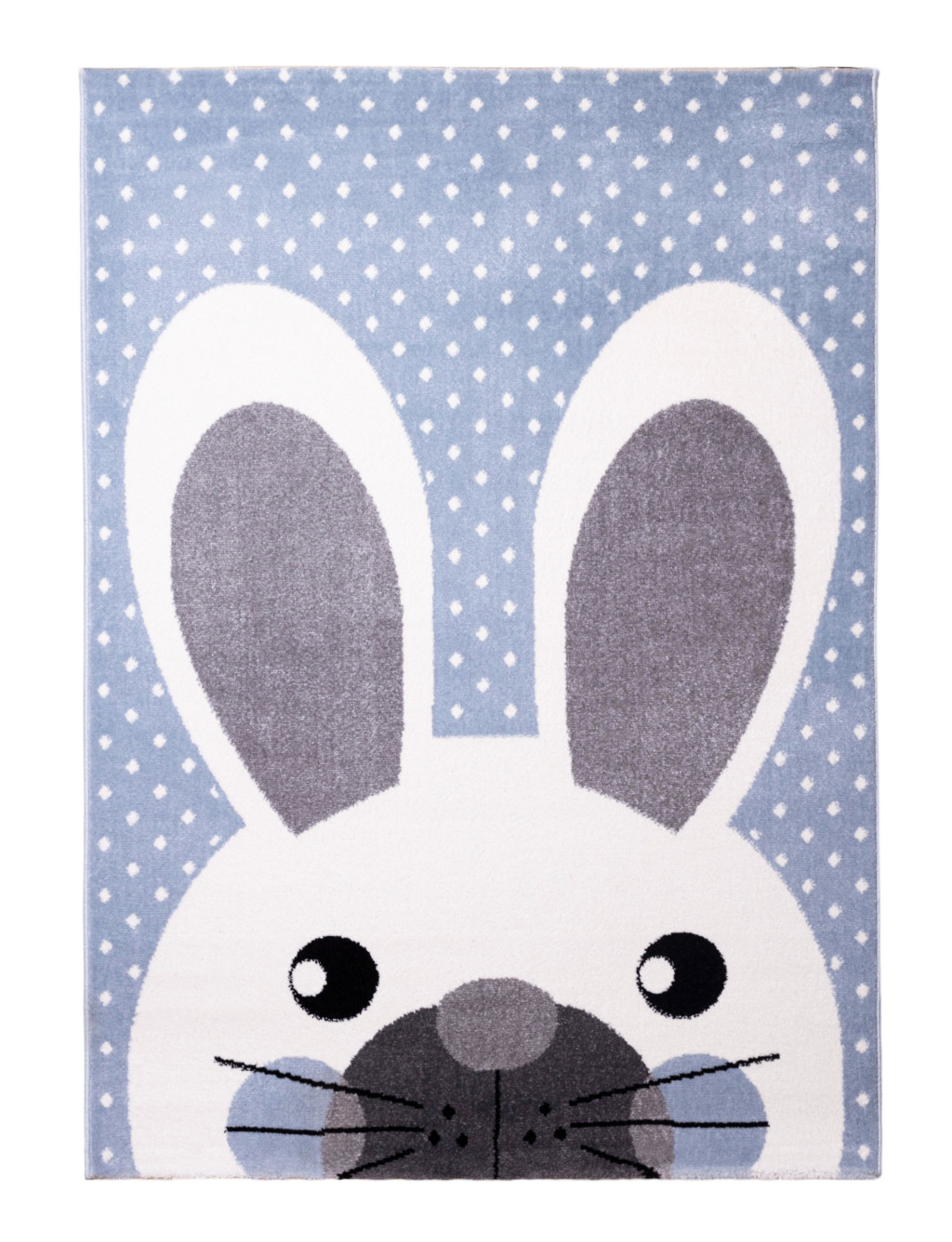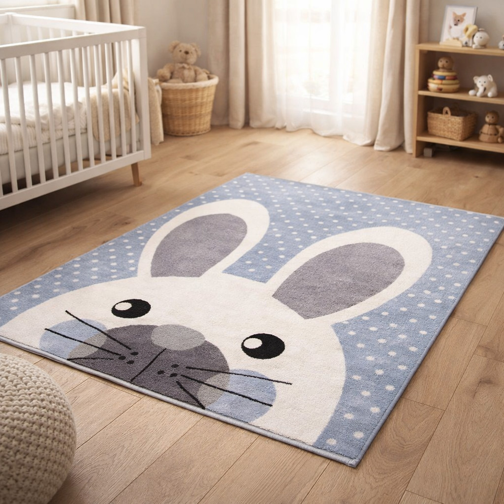 Világos pasztelkék alapon krém pöttyös szőnyeg bájos nyuszifigurával.